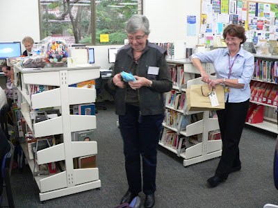 Thanks to the wonderful librarians we were able to have the library for an hour before the normal opening time and so could have the use of the staff room for our morning tea - with so much food brought by the Epping group that we were able to leave the staff room supplied with goodies for the next few days. The library was decorated with balloons, knitted flowers and rugs courtsey of Sue, Mani and Deni of the library staff, and Kris and Vida from the Epping group.